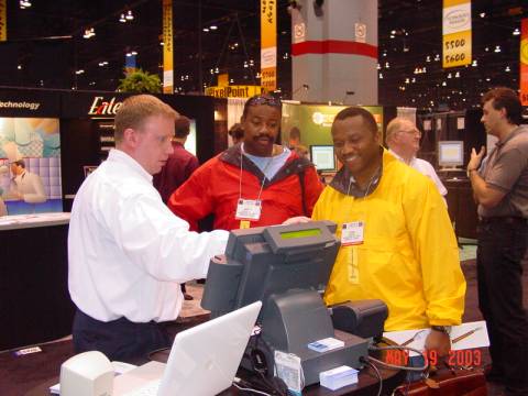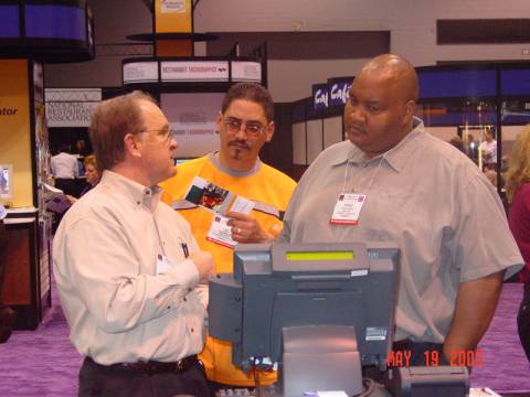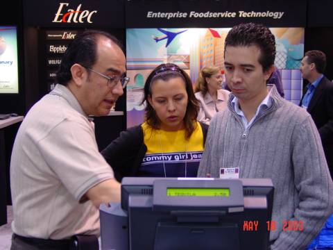 Edgar De La Rosa of Delarosa POS advises two of the many international visitors to the booth.
