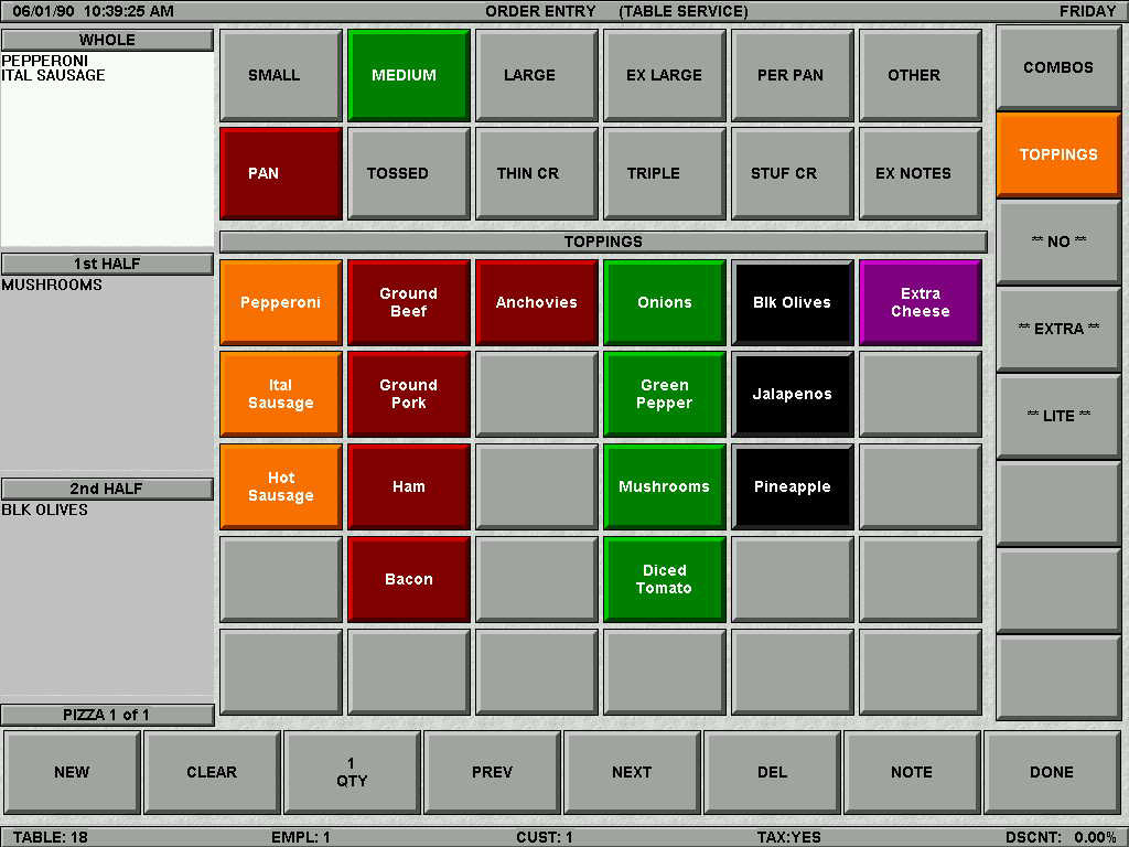 Unlike other food and beverage items, taking a Pizza order can be a trying experience. Besides selecting a size and type (thin crust, deep dish, etc.), one has deal with combos (Hawaiian, Meat Lovers, etc.), extra toppings on the whole or parts of the pizza, as well as the infamous special instructions (no onions, no anchovies, etc.) By applying touch screen technology and efficient screen design, ASI's Pizza Order Entry provides the quickest and clearest user interface for this purpose. From one screen, the user can fully define one or more pizzas. With ASI's pizza screen you can add and remove toppings, and change the size and/or crust of a pizza with a single touch. This super efficient user interface is ideal for high volume Pizza Delivery operations. On the management side, a flexible Pizza setup program allows easy programming of Pizza combinations and prices.